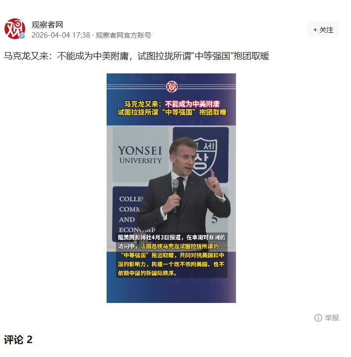 不雅察者网:《马克龙又来:不可称为中好意思从属,试图拉拢所谓中等强国抱团取暖》