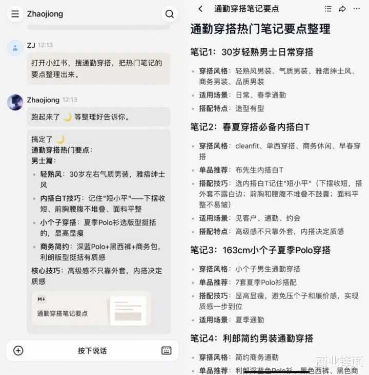 比如,我让它大开小红书,搜通勤穿搭,把热点条记的重心整理出来。