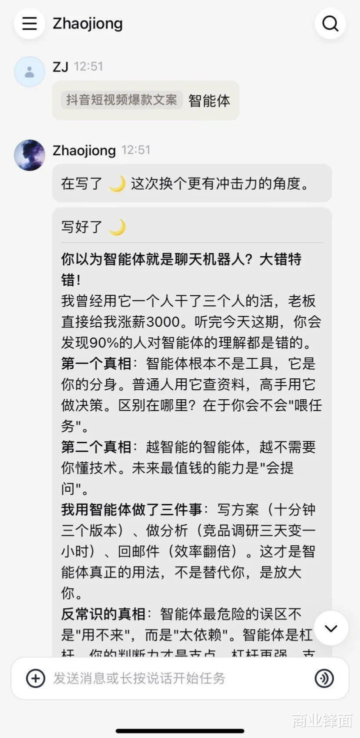 输入“智能体”之后,它就能径直围绕这个主题写出了一篇带有爆款潜质的案牍。