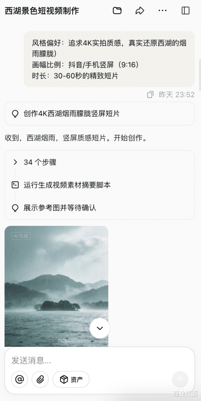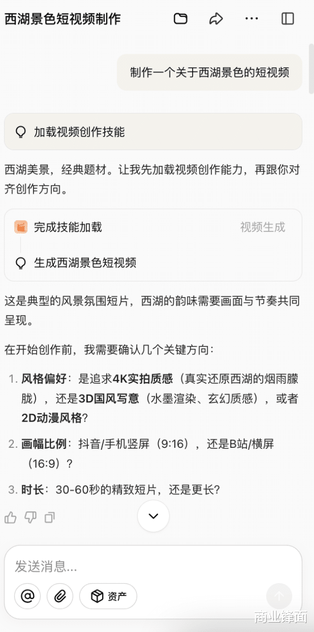 比如,我让生成一个对于西湖好意思瞻念的短视频,它先跟我证明了格调偏好、画幅比例和时长。