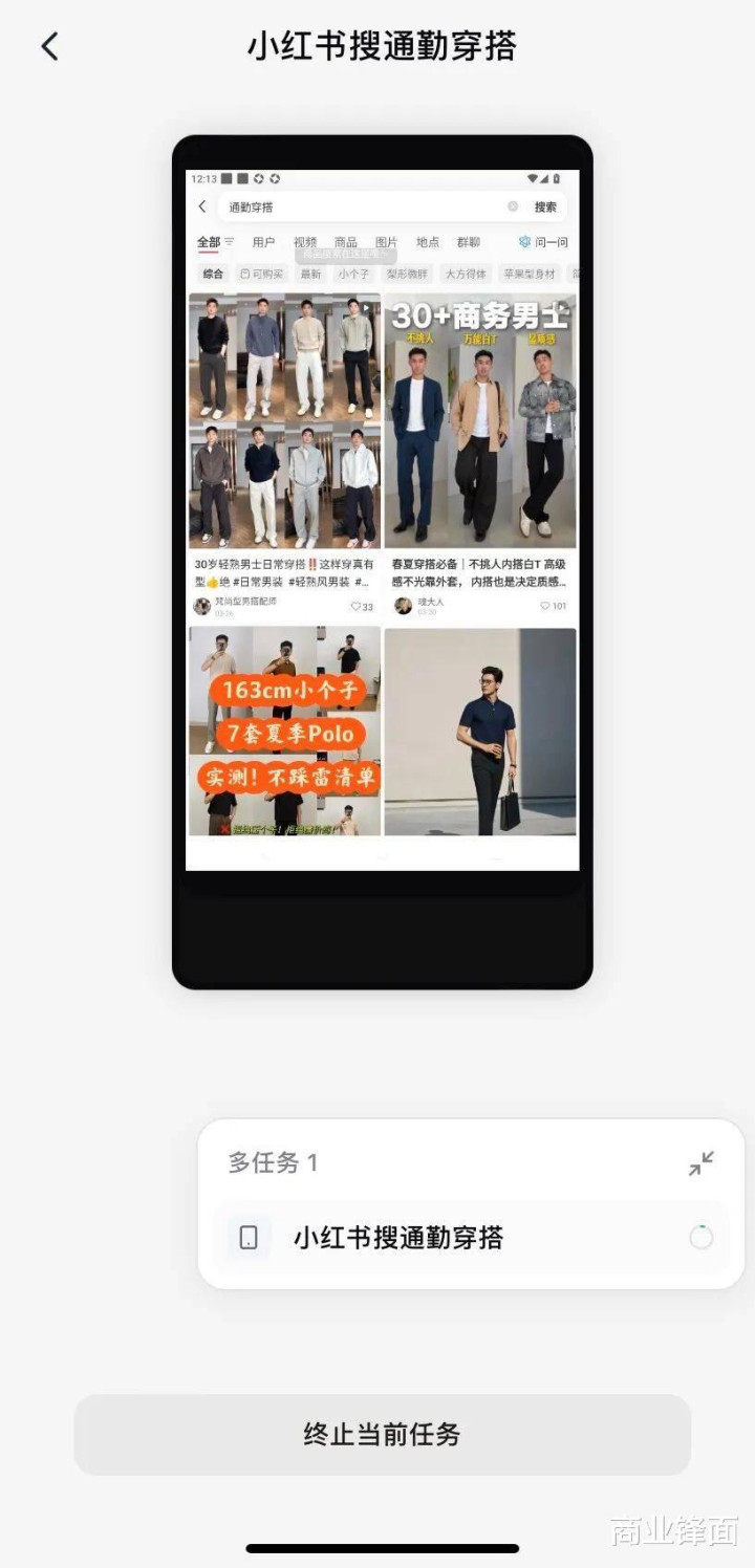 它会我方在云手机设立端大开小红书App,输入“通勤穿搭”的要害词。