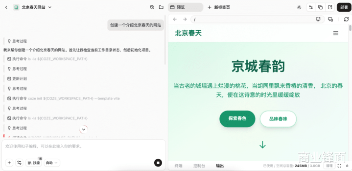 扣子编程CLI此次同步上线了。一句话描摹需求,Agent就在后台我方敲代码、跑测试、部署上线。比如,我让Coze CLI创建一个先容北京春天的网站。从名堂创建到预览发布,全程无谓碰代码,对于我这种所有这个词不懂设施的东谈主来说的确挺香。