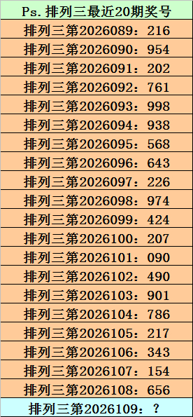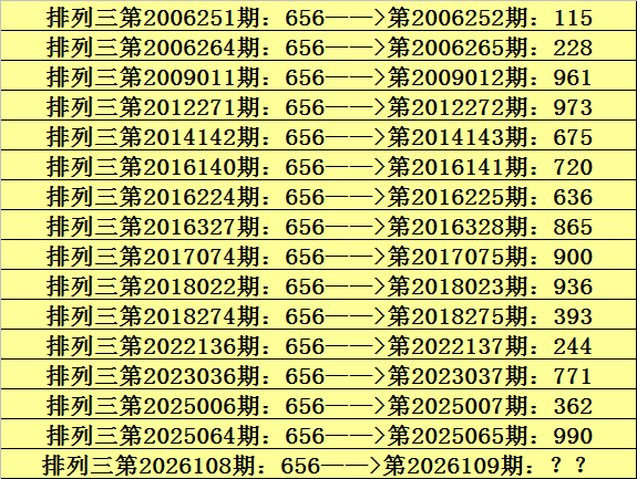 第2026108期摆设三奖号为656,历史上该号码组选开出37次,下期奖号分裂为:814、157、981、115、228、184、565、438、961、535、988、973、439、833、675、764、491、966、720、636、285、865、307、900、936、393、809、946、321、269、244、348、771、259、362、990。
