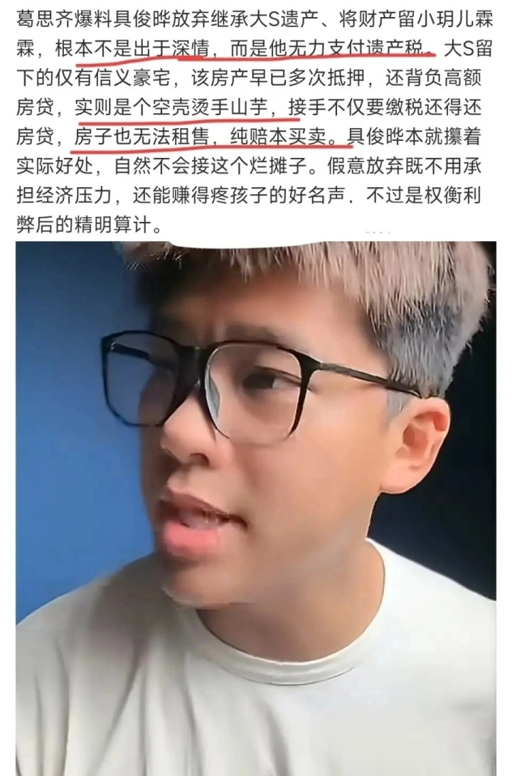 大S生前留下的不只有回忆,还有数套房产的高额贷款、遗产税等隐忧。具俊晔退出继承,看似壮烈,其实也是“知难而退”。