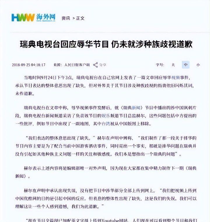 2018年又出了一档子事。一位中国旅客因为旅店预订问题,被瑞典警方从旅店带出。视频传遍网罗之后,中海社交部发了旅行教化。紧接着瑞典电视台的节目掌握东说念主拿中国旅客开涮,搞了些特地初级的"幽默"。双方王人以为我方屈身,但这些画面刻在了两国老庶民的脑子里,成了一根根拔不掉的刺。