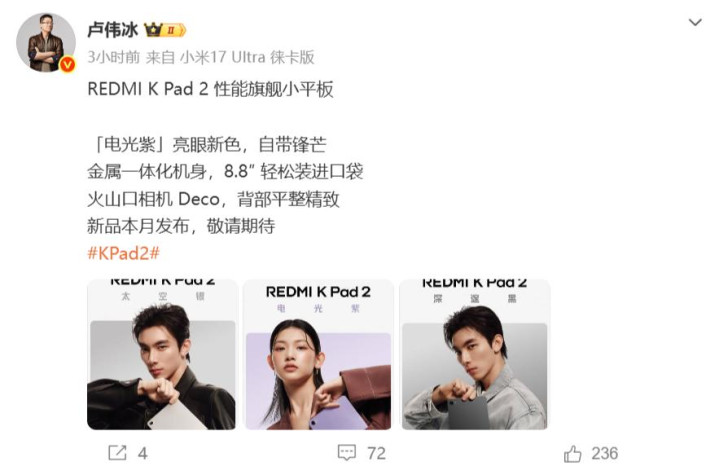 红米k pad 2接受8.8英寸LCD屏幕,扶植165Hz高刷,是一部高性能小屏平板,接受金属一体化机身和火山口相机模组盘算,背部平整单手也能操作,共有紫色、银色、玄色三款配色。