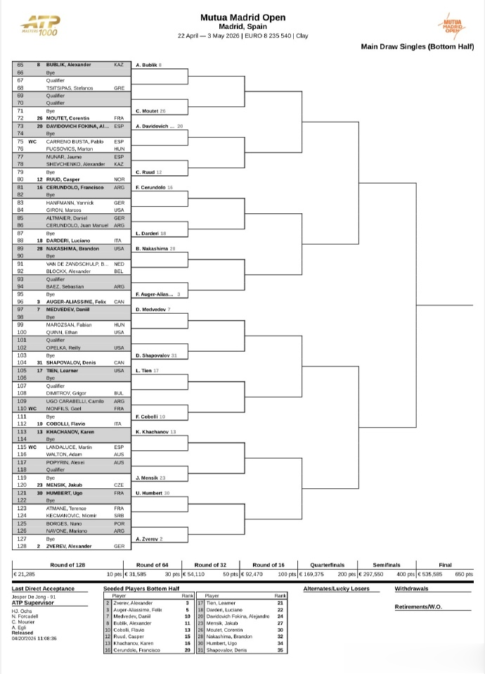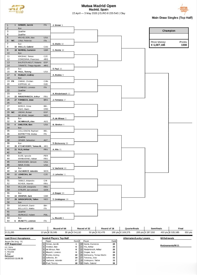 - 滚球app官网下载 马德里大师赛签表: 张之臻vs科普里瓦, 辛纳头号种子出战2026-04-22