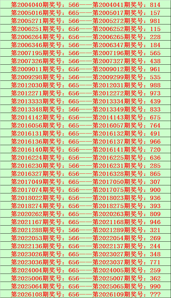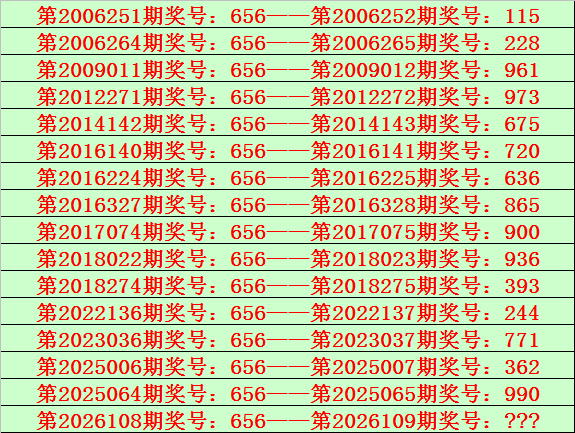 陈设三第2026108期开出奖号656,该号码直选类型历史上出现了16次,前15次开出之后期下期奖号为:115、228、961、973、675、720、636、865、900、936、393、244、771、362、990,见下表: