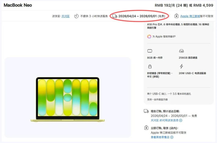 继首发售罄之后,近日MacBook Neo再次出现昭着的“缺货”情况。苹果官网自大,现不才单的话,投递期间最早也要比及4月24日了。