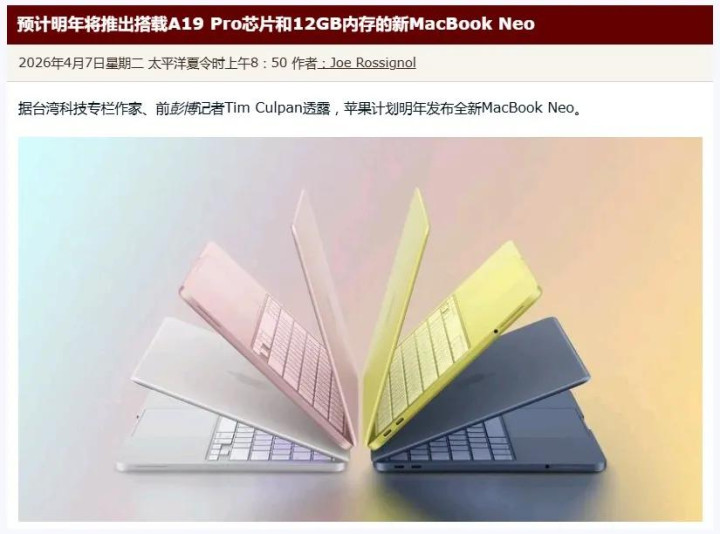 新款MacBook Neo 2在外不雅设想方面臆度不会有昭着的更动,但有望升级搭载A19 Pro芯片(即iPhone 17 Pro同款芯片),同期将内存提高至12GB。