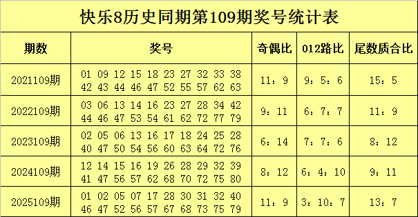 第5、6位号码分析:历史同时第109期散播在16-28之间,其中奖号奇偶比为5:5、012路比为1:4:5、余数质合比为4:6,客岁同时开出奖号:17和28,为奇号+偶号、2路+1路、质尾+合尾组合,本年第109期预测第5、6位开出全奇组合,参考两码13+17。